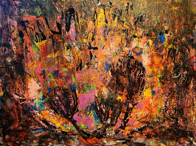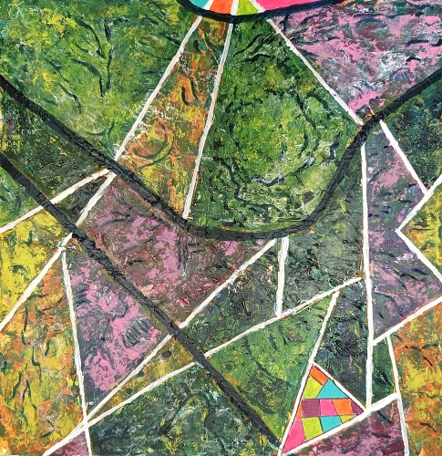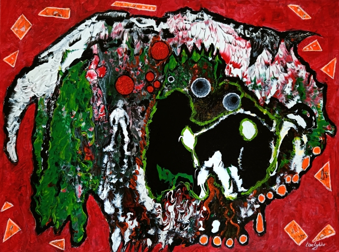 Akryl/lærred 100x100x4cm.
